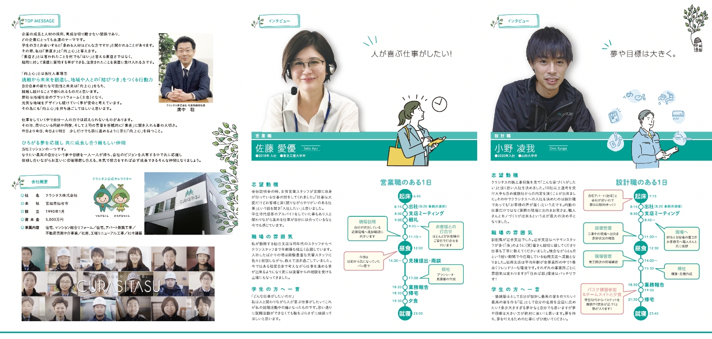 毎月1回のペースで折込チラシの制作を請け負っており、そのつながりからリクルート用パンフレットのデザインコンペへの参加を打診され、採用されました。コーポレートカラーを基調に、美しい仕上がりをモットーとするコンセプトに沿って清潔感のあるデザインにしました。